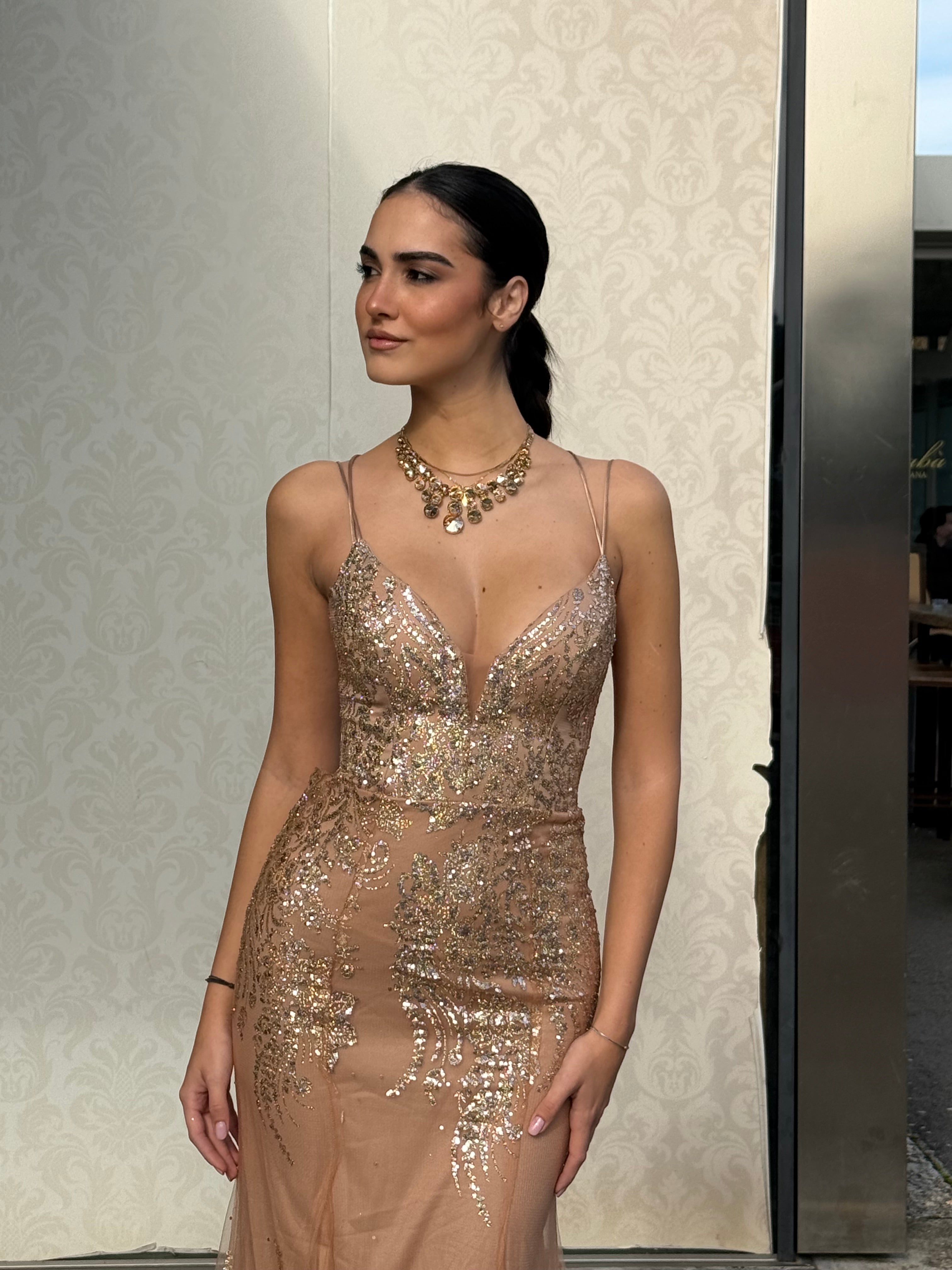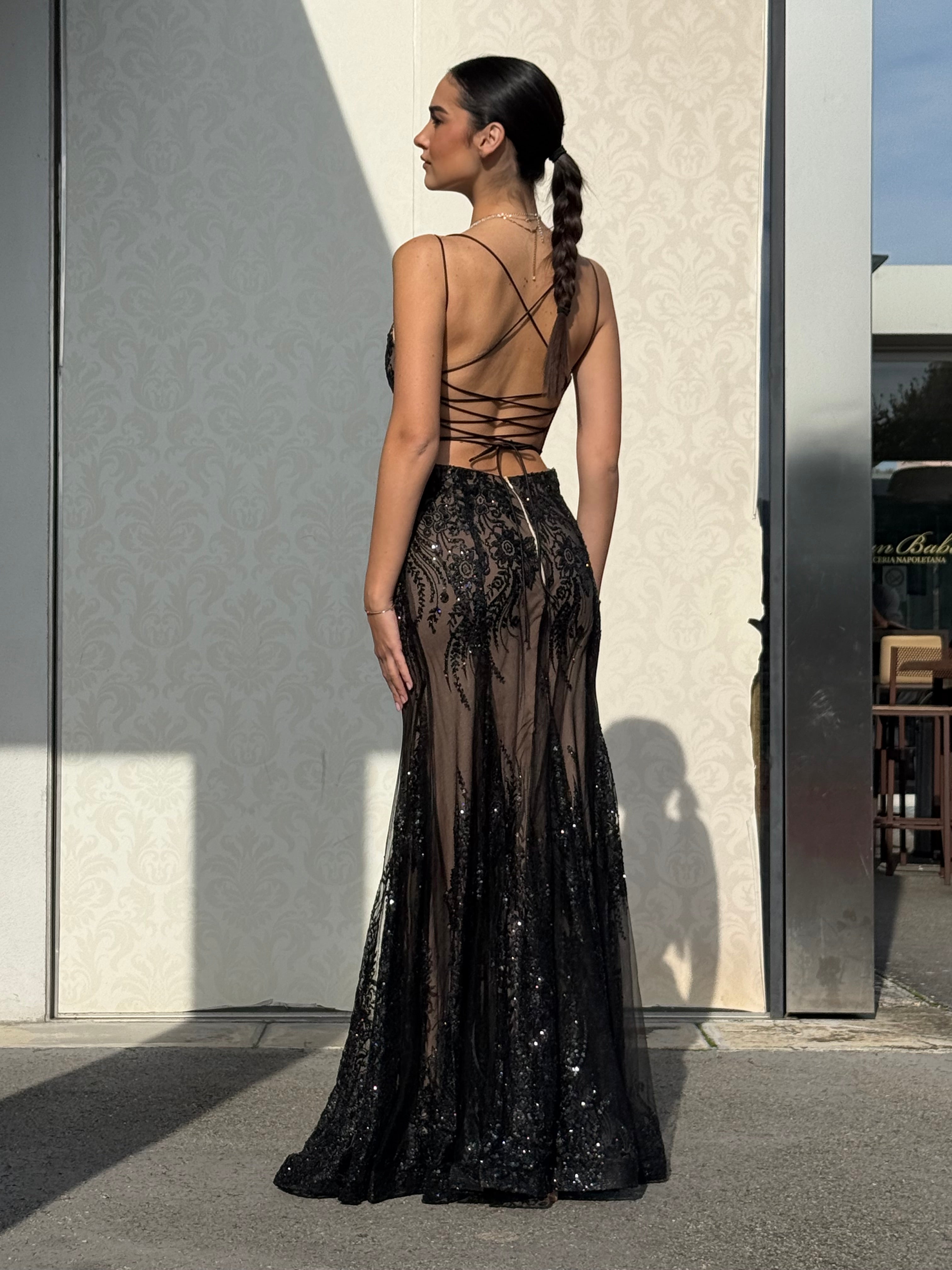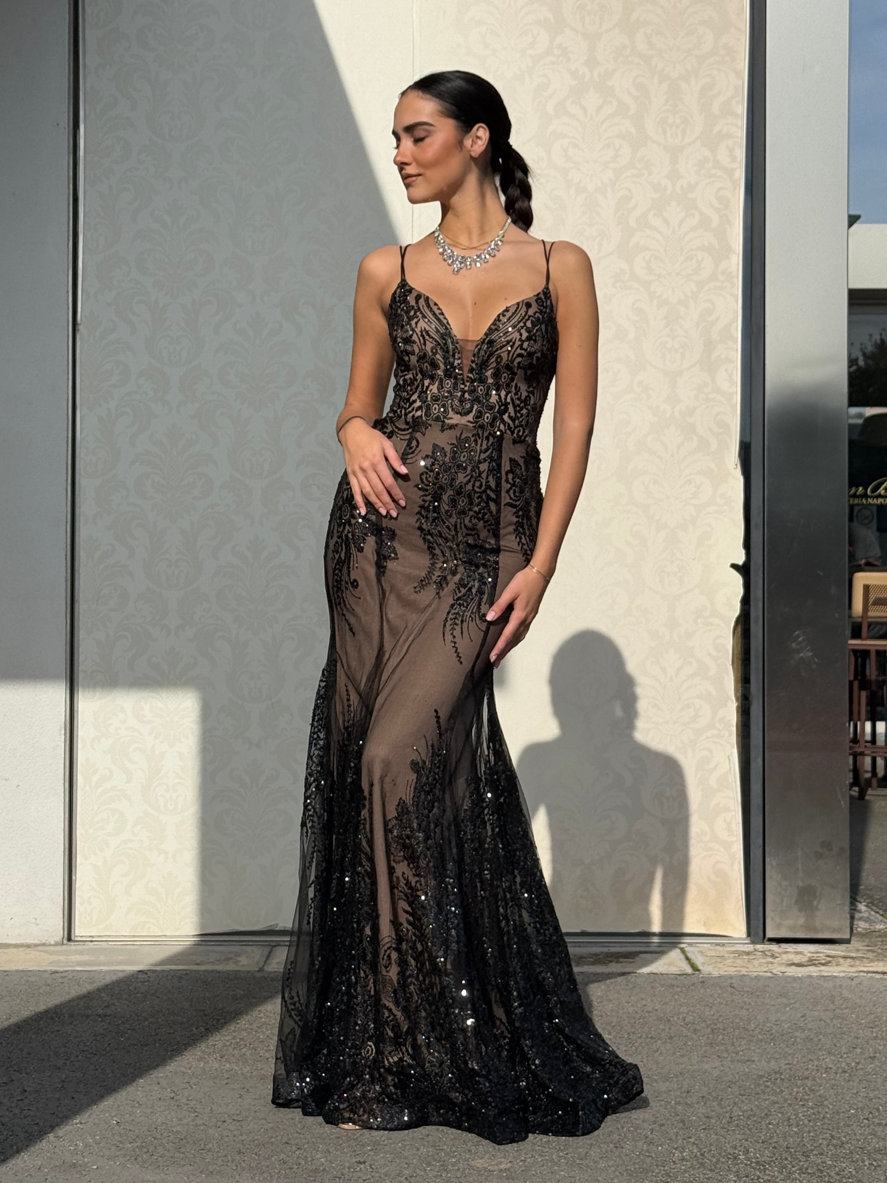 Abito a sirena con pizzo e pailettes di due colori, perfetto per occasioni speciali. Il corpino a cuore abbraccia delicatamente il décolleté, mentre il pizzo e le pailettes creano un effetto luminoso e sofisticato. La silhouette a sirena valorizza le curve con eleganza, regalando un look affascinante e sensuale.