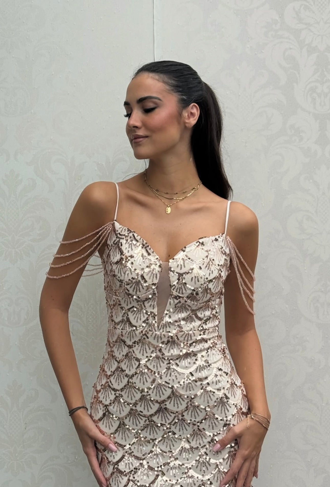 Abito sirena elegante e affascinante, realizzato con glitter e pailettes in tonalità champagne. Il bustino a cuore abbraccia delicatamente il décolleté, creando una silhouette sofisticata e sensuale. Perfetto per serate speciali, matrimoni e occasioni che richiedono un tocco di glamour. La gonna a sirena valorizza le curve con stile, mentre i dettagli scintillanti garantiscono un effetto luminoso e raffinato. Un capo che trasforma ogni momento in un'occasione indimenticabile.